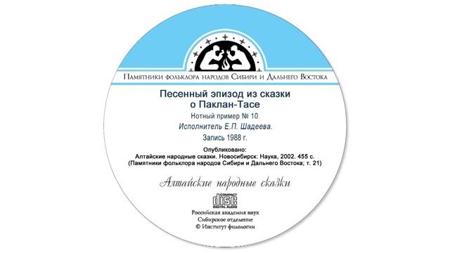 Песенный эпизод из сказки о Паклан-Тасе, телеутский диалект, нотный пример № 10. Исполнитель Е.П. Шадеева. Запись 1988 г. Опубликовано: Алтайские народные сказки. Новосибирск: Наука, 2002. 455 с. (Памятники фольклора народов Сибири и Дальнего Востока; т. 21).