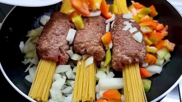 Вкуснейшее блюдо из мясного фарша , спагетти и овощей !Новый рецепт в описании