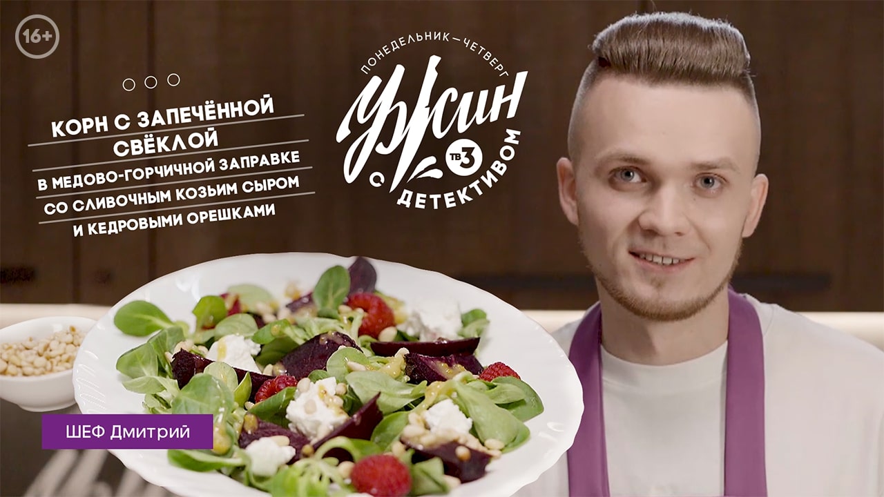 Вкусный салат – идеальный вариант для легкого летнего "Ужина с детективом". Поэтому врываемся в эту неделю с нового вкусного рецепта от шеф-повара Дмитрия! 16+ Для приготовления этого блюда вам понадобятся: Свёкла – 1 шт. Салат корн – 1 шт. Сыр сливочный козий, мягкий – 1 шт. Кедровые орешки – 30 гр. Малина свежая (желательно) или замороженная – 5-7 ягод Для соуса: Мёд – 1 ст. л. Горчица зернистая – 1 ст. л. Горчица обычная – 1 ч. л. Уксус винный – 1 ст. л. Чеснок – 1 зубчик Масло растительное – 2 ст. л. Соль – 1 щепотка Шаг 1. Свёклу с растительным маслом и солью завернуть в фольгу и поставить в духовку на 1 ч. 20 минут при 180° С. Периодически добавлять немного воды на противень. Шаг 2. Для соуса – соединить все ингредиенты и хорошо перемешать их до однородной массы. Шаг 3. Свёклу нарезать в произвольной форме, смешать с корном, козьим сыром, а затем выложить горкой на тарелку. Полить соусом, а сверху присыпать обжаренными кедровыми орешками и ягодами малины. Салат готов! Приятного вам аппетита!)