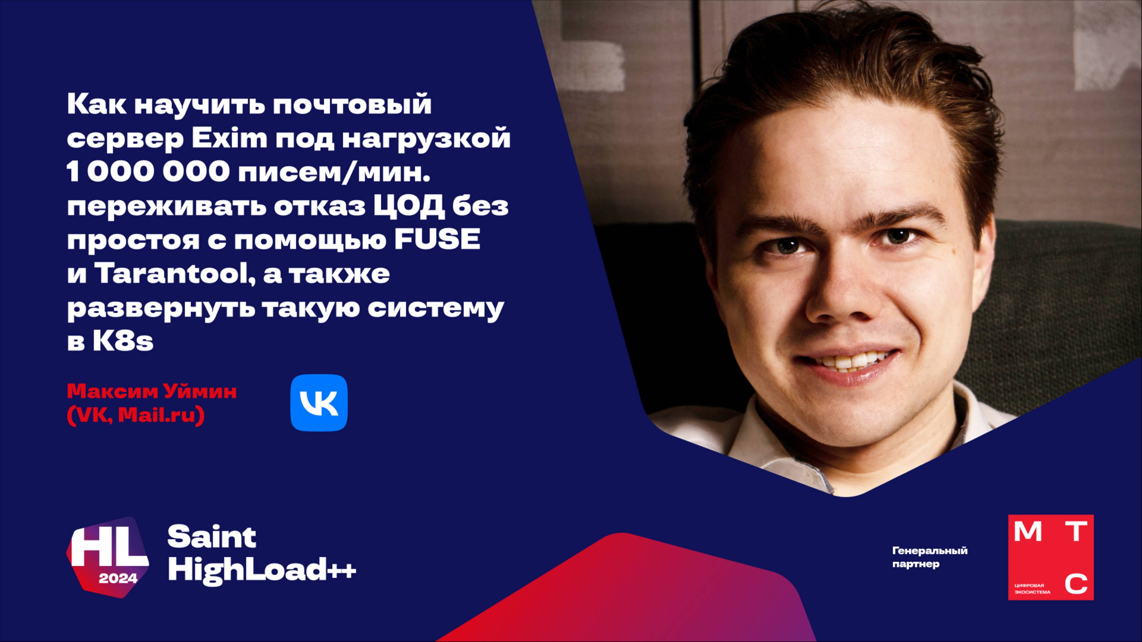 Приглашаем на конференцию HighLoad++ 2025, которая пройдет 6 и 7 ноября в Москве! Программа, подробности и билеты по ссылке: https://highload.ru/moscow/2025 ________ МТС — генеральный партнёр конференции Saint HighLoad++ 2024. ________ . Профессиональная конференция разработчиков высоконагруженных систем Saint HighLoad++ 2024 Презентация и тезисы: https://highload.ru/spb/2024/abstracts/11213 В Почте Mail.ru стояла задача: научить бэкенд на основе почтового сервера Exim с нагрузкой 1 000 000 писем/мин. переживать отказ ЦОД без простоя и потери писем. Основная сложность была в том, что почтовый сервер использует локальный диск для хранения очереди писем... Нашли ошибку в видео? Пишите нам на support@ontico.ru