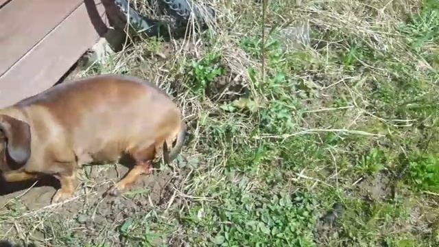 Маня лезет под сарай.