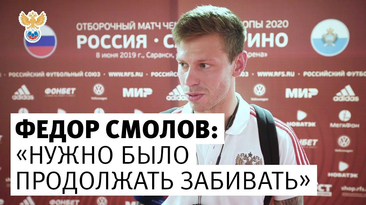 В субботу, 8 июня, сборная России провела первый домашний матч отборочного раунда ЕВРО-2020. На "Мордовия Арене" в Саранске наша команда крупно переиграла Сан-Марино, одержав самую крупную победу в истории. После успеха нападающий национальной сборной Федор Смолов поделился впечатлениями от игры. __ rfs.ru VK vk.com/teamrussia OK ok.ru/teamrussia Twitter twitter.com/teamrussia Instagram instagram.com/teamrussia/