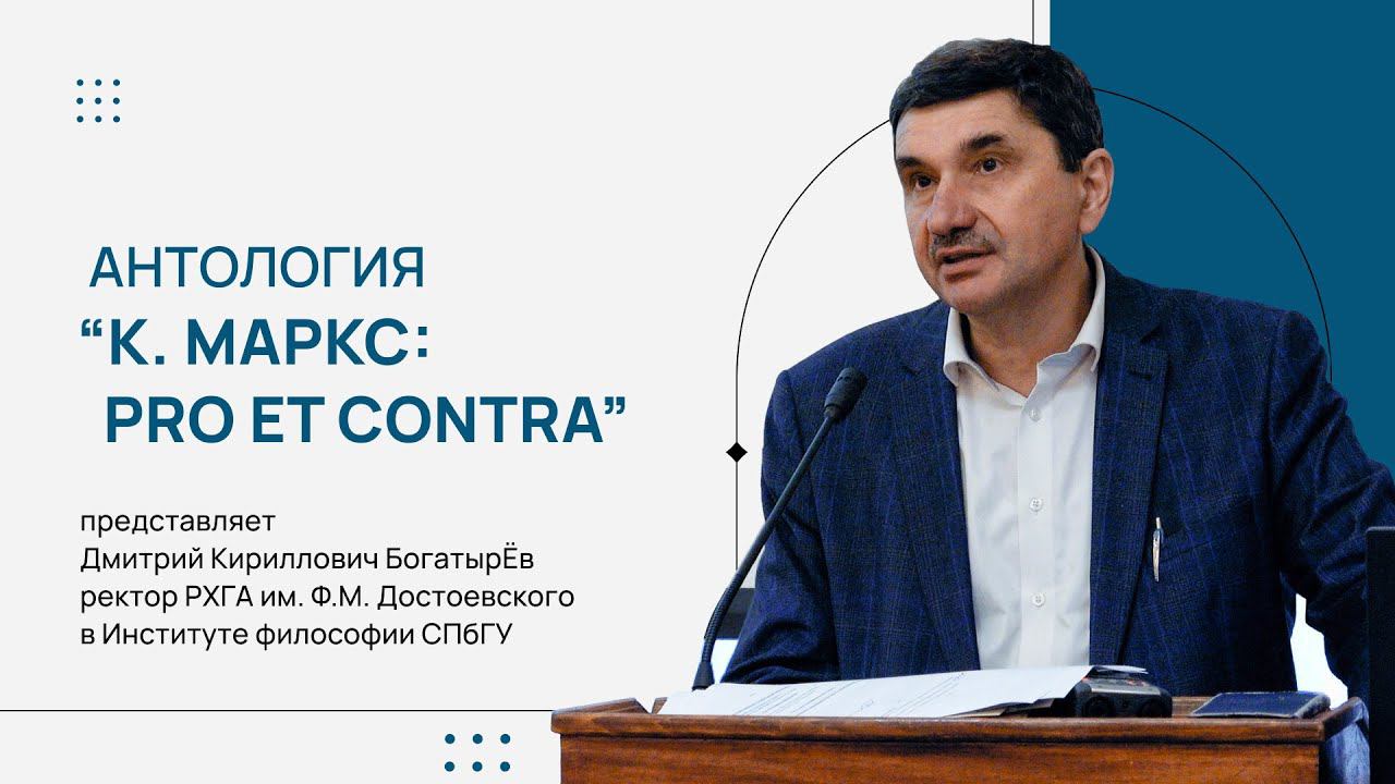 Ректор РХГА им. Ф.М. Достоевского Дмитрий Кириллович Богатырёв представил серию «Русский Путь: Pro et Contra» и новый том антологии о Карле Марксе в Институте философии СПбГУ 24 марта 2023 г.: К. Маркс: pro et contra // Быстров В.Ю., Докучаев И.И., Ермичёв А.А. (сост.). – СПб: РХГА, 2021. – 758 с. Открыл презентацию и поздравил Дмитрия Кирилловича с 60-летием директор Института философии Никита Всеволодович Кузнецов. В презентации принял участие составитель тома – заведующий кафедрой онтологии и теории познания философского факультета СПбГУ Илья Игоревич Докучаев. Вопросы, выступления: • Заведующая кафедрой философии религии и религиоведения философского факультета СПбГУ Марианна Михайловна Шахнович, • Заведующий кафедрой философской антропологии Института философии СПбГУ Борис Васильевич Марков, • Доцент кафедры истории философии Института философии СПбГУ Антон Александрович Иваненко. РХГА в сети: https://vk.com/rhgaru Официальный сайт http://www.rhga.ru