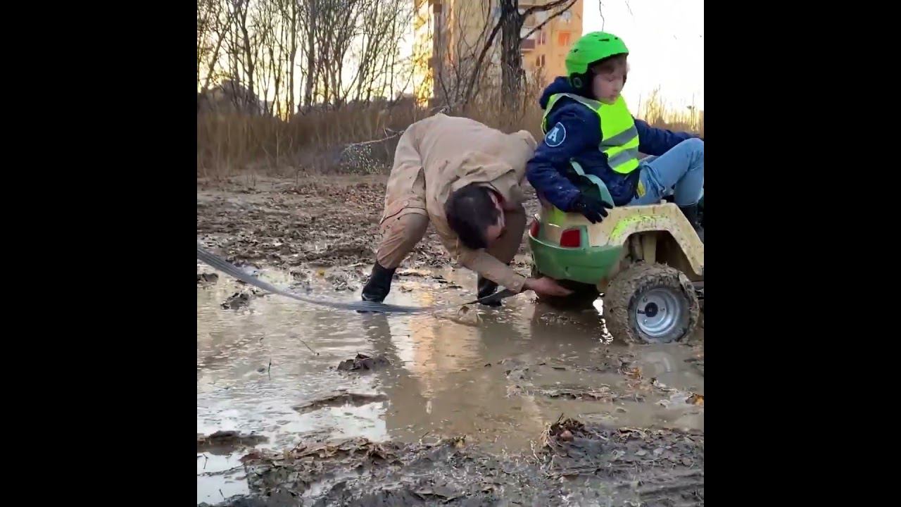 Даня пытается вытащить машину из лужи на буксире. Манкиту