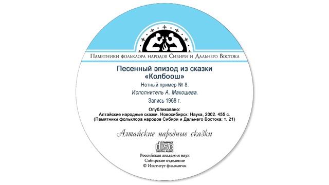 Песенный эпизод из сказки «Колбоош», тубаларский диалект, нотный пример № 8. Исполнитель А. Макошева. Запись 1968 г. Опубликовано: Алтайские народные сказки. Новосибирск: Наука, 2002. 455 с. (Памятники фольклора народов Сибири и Дальнего Востока; т. 21).