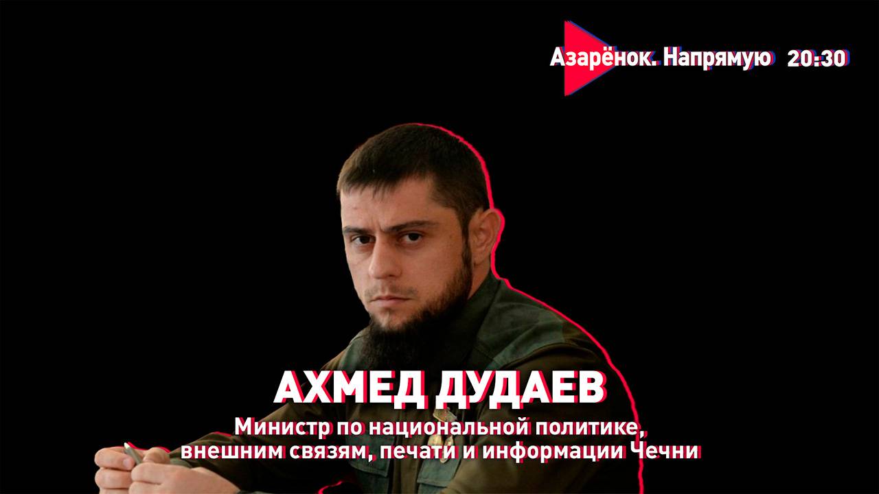 Присоединяйтесь к нашему Telegram-чату: https://t.me/+qTXxHkhwB6ZhOTIy 2 октября в 20:30. Проект «Азарёнок. Напрямую». О важном говорим в прямом эфире. Интервью с министром по национальной политике, внешним связям, печати и информации Чечни Ахмедом Дудаевым.