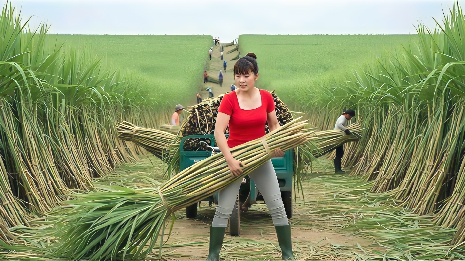 Собираю урожай сахарного тростника и везу на трицикле на продажу в деревню. Фуонг. Вьетнам