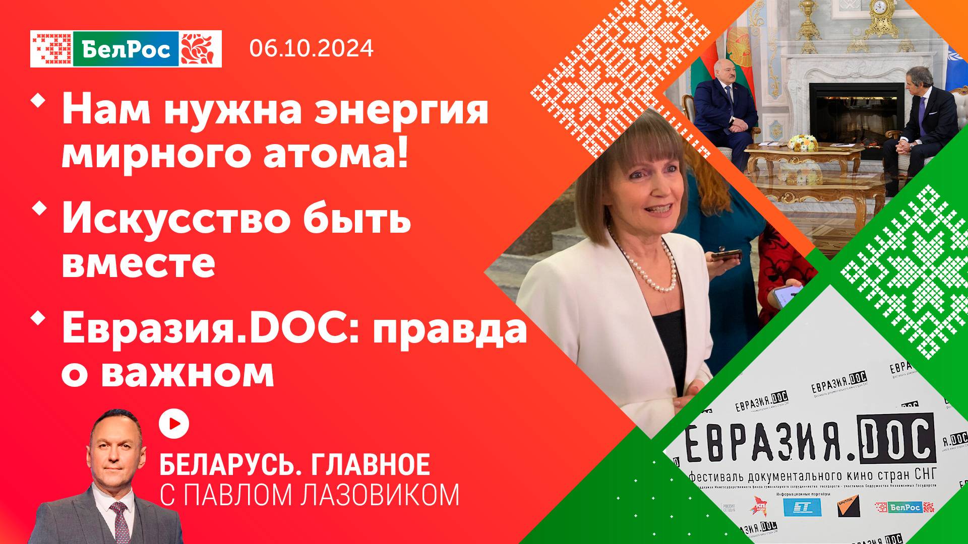 🔷 Кому и зачем нужны ядерные страшилки? Встреча с главой МАГАТЭ. Время развеять фейки. Ядерная безопасность, развитие мирного атома, а также общее усилие по реабилитации территорий, пострадавших от аварии на Чернобыльской АЭС. И готовность реагировать – крупнейшее учение МЧС России и Белоруссии в Подмосковье. 🔷 Формула сотрудничества с регионами от Лукашенко и как лучше понять Якутию. Сферы взаимного интереса и совместные технологии, как ответ Западу. 🔷 Сферы взаимного интереса и совместные технологии, как ответ Западу. Обменные гастроли, приглашённые звёзды и яркие премьеры – большое интервью программы. 🔷 Правдивая сила киноискусства: Смоленск и Минск стали центрами притяжения любителей документалистики. И, как правило, заокеанские. Фестиваль "Евразия.DOC" в союзном государстве. Кому удалось попасть на большие экраны? 📺Смотрите новый выпуск программы "Беларусь. Главное" на телеканале БелРос Ссылки на наши соц. сети Сайт: http://belros.tv/ Telegram: https://t.me/belrostv Одноклассники: https://ok.ru/group/55657426976918 ВКонтакте: https://vk.com/belrostv TikTok: https://www.tiktok.com/@belros_tv?_t=... RuTube: https://rutube.ru/channel/23501830/ Яндекс. Дзен: https://zen.yandex.ru/belrostvv Наши подкасты на Яндекс. Музыке: https://music.yandex.ru/album/25615251 #БольшойтеатрБеларуси #Лукашенко #ЕвразияDOC