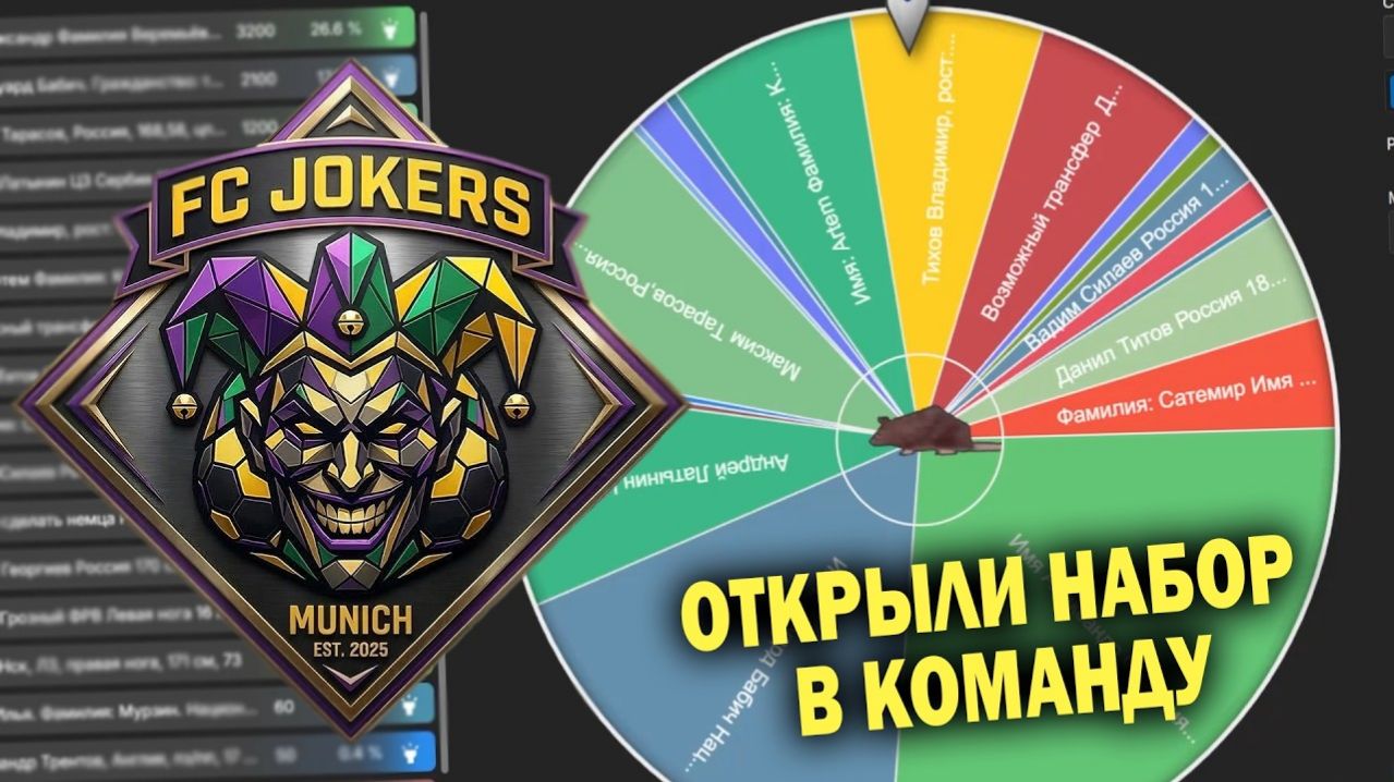 Проект ФК Джокеры стартовал, это новый проект в фк 26 (FC 26). Проект, в котором мы берём и создаём свой клуб и, ВНИМАНИЕ, подписываем туда игроков, придуманных подписчиками, можно даже ДОБАВИТЬ СЕБЯ и ВЫ всё ещё можете оставить свою заявку. В субботу в 20:00 по мск будет первый выпуск в прямом эфире, там будет донабор Форма заявки: Имя Фамилия Нация Рост Вес Позиция (любая, но не забывайте про конкуренцию) Рабочая нога Заявки можете оставлять (КОЛЕСО РЕШИТ ВАШУ СУДЬБУ, в прямом эфире) тут: Через донат (https://www.donationalerts.com/r/theprofitvison) (чем больше, тем выше шанс, но бывало и выпадали по 40 рублей варианты) - https://www.donationalerts.com/r/theprofitvison Альтернативный способ доната (тут можно и криптой) - https://donatepay.ru/don/maddryck Подписка на бусти (если подписан, просто напиши мне в личку заявку, я добавлю в колесо). Тут можно подписаться (https://boosty.to/tpv) - https://boosty.to/tpv (любая платная подписка позволяет писать мне в личку) Все подробности тут: https://t.me/tpvfootball
