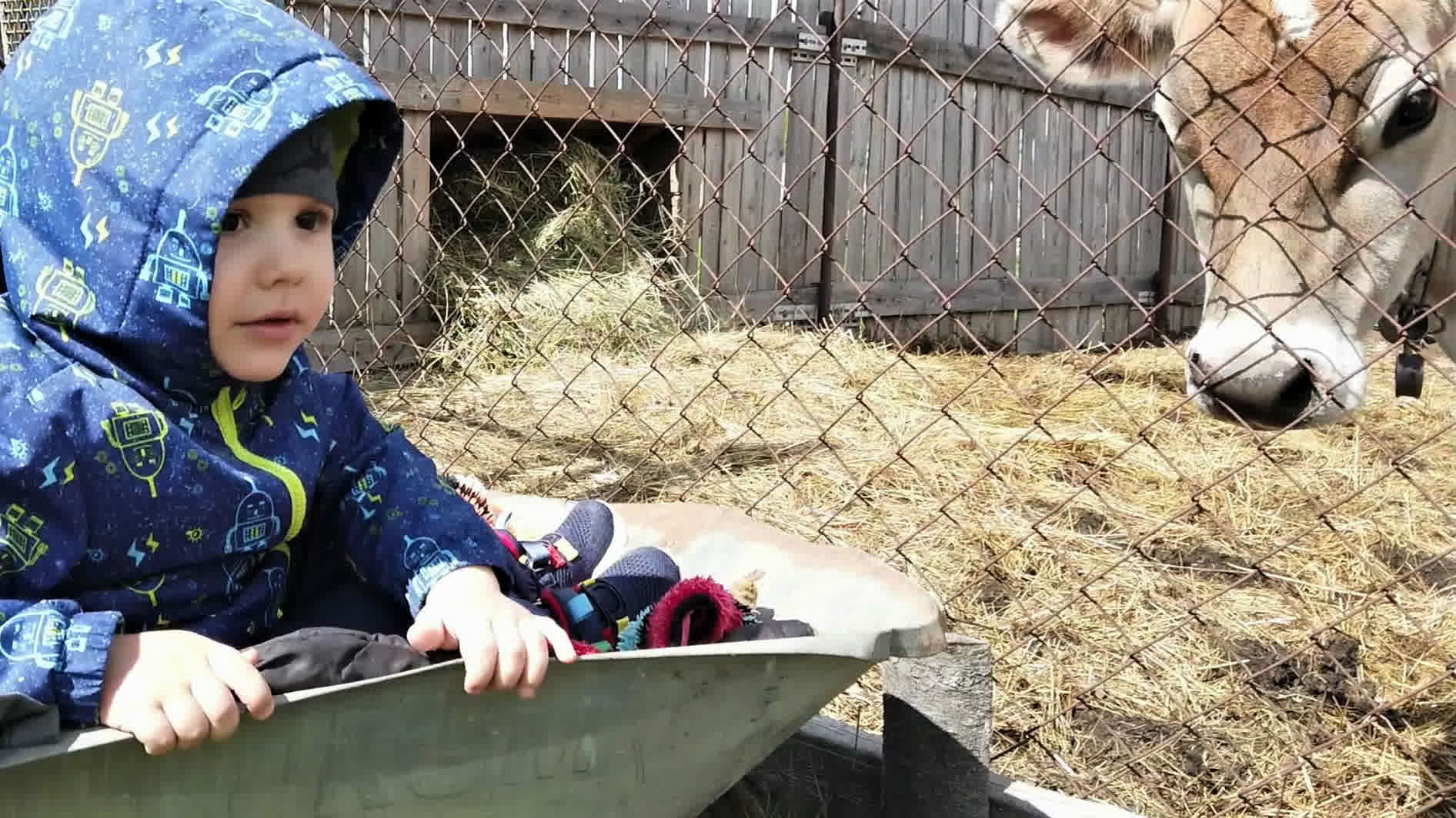 Трофимка катается на дачной тачке по деревне, заехал в гости к корове и курочкам ! Отличное средство передвижения, аналог любой прогулочной коляске ;)))