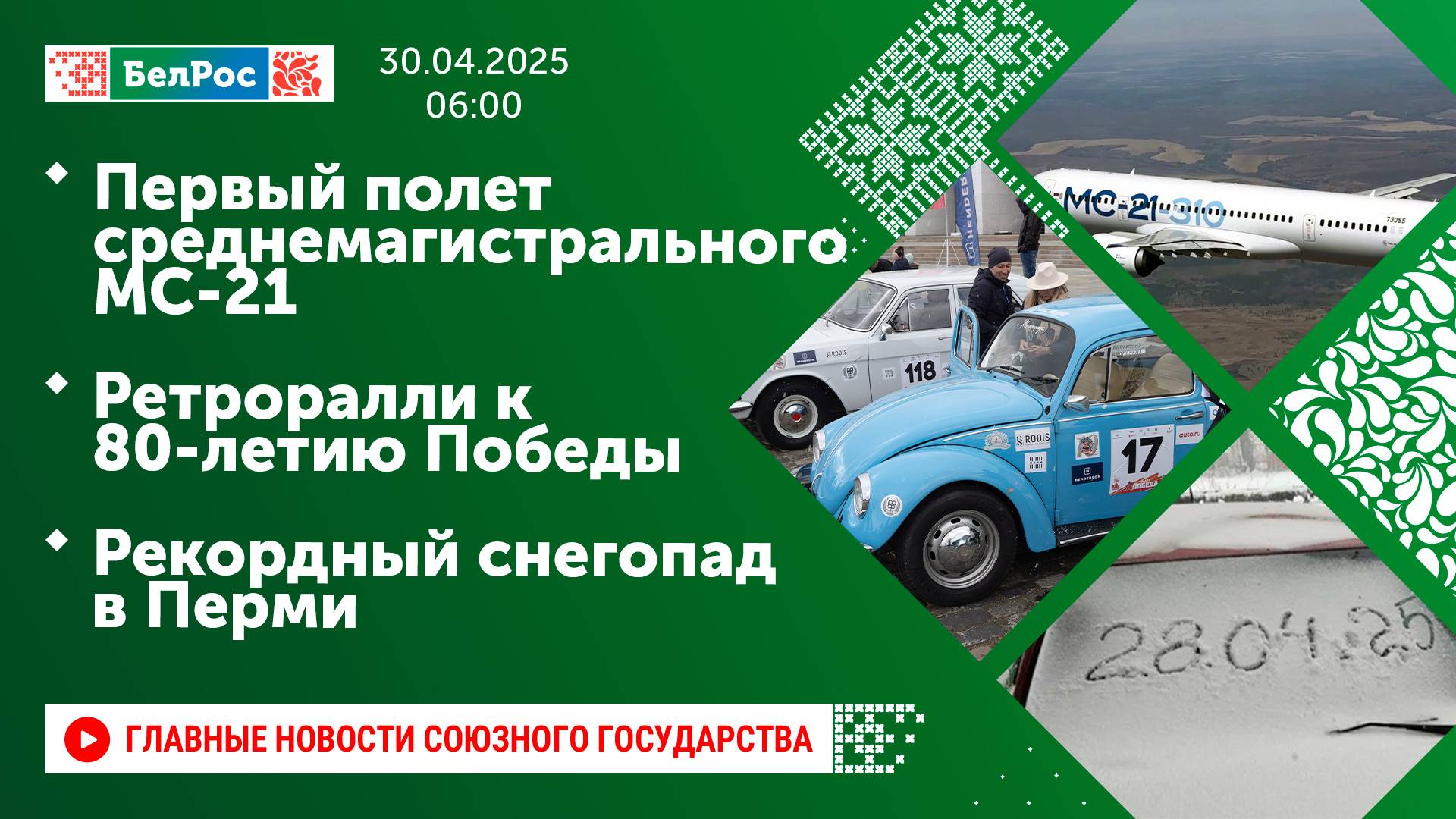 Закадровый текст озвучивает *ИИ Антон* Новости 30.04.2025 на 06:00 - В Москве открылась масштабная выставка к 80-летию Победы. - Самолёт МС-21 с импортозамещёнными системами совершил первый полёт. - В Москве стартовало ретроралли к 80-летию Победы. - Бывших узников нацистских концлагерей чествовали в Заводском районе Минска. - В ЯНАО развернули Знамя Победы на вершине гор Ламба-Пэ и Поур-Кеу. - Военнослужащие Вьетнамской народной армии репетируют парад ко Дню Победы в Москве. - Сильный снегопад накрыл улицы Перми. Смотрите главные новости Союзного государства на телеканале БелРос. Ссылки на наши соц. сети Сайт: http://belros.tv/ Telegram: https://t.me/belrostv Одноклассники: https://ok.ru/group/55657426976918 ВКонтакте: https://vk.com/belrostv TikTok: https://www.tiktok.com/@belros_tv?_t=... RuTube: https://rutube.ru/channel/23501830/ Яндекс. Дзен: https://zen.yandex.ru/belrostvv Наши подкасты на Яндекс. Музыке: https://music.yandex.ru/album/25615251 #главныеновости #новостисегодня #СоюзноеГосударство