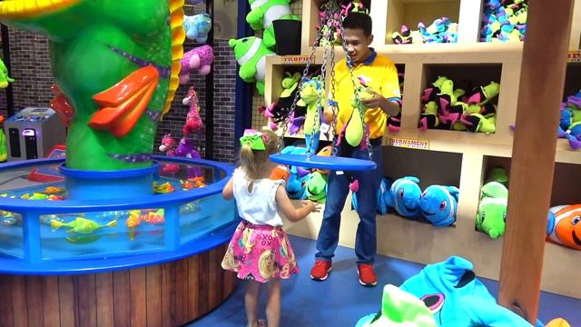 Настя развлекается на аттракционах с любимой куклой
