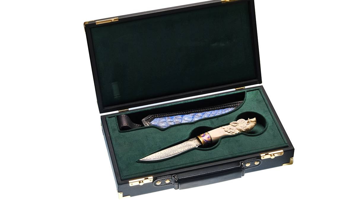 "Кабан" (мозаичный дамасск Матвеева), рукоять - рог лося, проставки - зуб мамонта, футляр