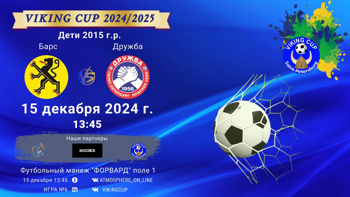 VIKING CUP среди команд 2015 г.р. (U9), Поле 1 15 ДЕКАБРЯ 2024 САНКТ-ПЕТЕРБУРГ, ФЦ "Форвард" ФК "Барс" - ФК "Дружба"/VIKING CUP, Игра №6, 15-12-2024 13:45