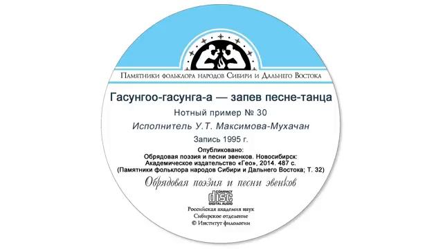 Гасунгоо-гасунга-а — запев песне-танца. Нотный пример № 30. Исполнитель У.Т. Максимова-Мухачан. Запись 1995 г. Опубликовано: Обрядовая поэзия и песни эвенков. Новосибирск: Академическое издательство «Гео», 2014. 487 с. (Памятники фольклора народов Сибири и Дальнего Востока; Т. 32).