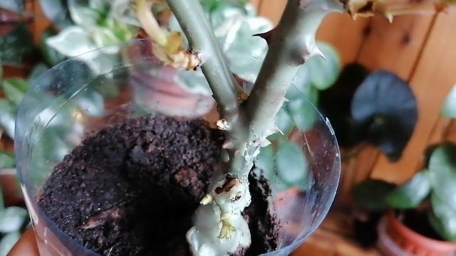 Чайно-гибридная роза Ингрид Бергман дала корни и побеги.
