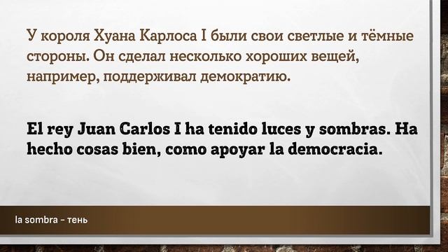 Урок основан на эпизоде подкаста взятом на сайте https://www.spanishpodcast.net Полная ссылка на эпизод подкаста с транскрипцией: https://www.spanishpodcast.net/kings-of-spain/ Полная ссылка на аудио файл эпизода: https://ia601706.us.archive.org/14/items/losultreyespspturrowiavvnxiir554238kkksjfaj449/losultreyespspturrowiavvnxiir554238kkksjfaj449.mp3?_=1 Данный материал предназначен исключительно в образовательных целях. Цель – заставить мышление учащегося формировать фразы, части фраз, на испанском языке. Каждая фраза повторяется три раза. Повторения происходит не подряд, а с некоторым "смещением", заставляя всё время мысленно переключаться на другую фразу. Пауза между фразами служит для того, чтобы вспомнить хотя бы одно слово, часть фразы или всю фразу на испанском языке. Чем длиннее фраза на русском языке – тем длиннее пауза до фразы на испанском языке. Достаточно, если человек самостоятельно начинает формировать хотя бы кусочки фразы, некоторые слова. Данный вид упражнений не стоит делать более одного часа за один раз. Достаточно прослушивать такие упражнения в фоновом режиме: замимаясь домашними делами, находясь в дороге или на прогулке, занимаясь спортом. Чтобы выучить любой язык необходимо «провести с ним» 10 000 часов. #испанский #испания #слова #фразы #aprender #español #españa #español #испанскийязык #испанскийбесплатно #испанскийэффективно #учимиспанский #испанскийучить #shadowing #ShadowingTechnique #Lerntechnik #произношение #грамматика #subjuntiv #expresiones #shadowingmethode #эффективно #españolonline #españoloffline #aprenderespanolonline #pimsleur #paulpimsleur Слова и выражения из этой части подкаста: ================================================ aún es pronto - ещё пока рано, ещё не время convertirse - превращаться, становиться debido - по причине, из-за educado - образованный el puesto - должность, место el sucesor - наследник, преемник fue nombrado - был назван, был назначен, стал huir - сбежать, скрыться ingobernable - непослушный, неуправляемый la dictadura - диктатура la enfermedad - заболевание, болезнь la juventud - молодость, юношество la sombra - тень la tendencia - тенденция, тренд le dio tiempo - ему хватило времени, он успел que nos han tocado - с которыми мы сталкивались, имели дело un golpe de Estado - госпереворот, путч una tradición familiar - семейная традиция