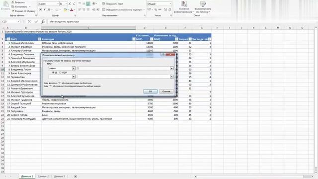 Как создать настраиваемый фильтр в Excel? В Excel встроены мощные фильтры, но иногда стандартной фильтрации недостаточно. В этом видео разберем настраиваемые фильтры, которые помогут вам отбирать только нужные данные по сложным условиям! Что можно делать с настраиваемыми фильтрами? ✅ Фильтровать по начальной букве (например, фамилии, начинающиеся с "А"). ✅ Отбирать диапазоны значений (например, состояние от 5 до 10 миллиардов). ✅ Создавать условные фильтры (например, если доход больше 1 млрд ИЛИ фамилия начинается с "К"). ✅ Гибко комбинировать текстовые и числовые условия. Как это работает? 1️⃣ Щелкаем на кнопку фильтра в интересующем поле. 2️⃣ Выбираем текстовые фильтры или числовые фильтры. 3️⃣ Нажимаем "Настраиваемый фильтр". 4️⃣ В появившемся окне задаем условие (например, "начинается с А"). 5️⃣ Нажимаем ОК – и готово! ⚡ Пример на практике Допустим, мы хотим отобразить бизнесменов, чьи имена начинаются на "А". Для этого: ✔ Выбираем поле ФИО → Текстовые фильтры → Настраиваемый фильтр. ✔ Указываем "Начинается с" → "А". ✔ Excel моментально отфильтрует только нужные данные! Кому это пригодится? ✔ Финансистам и аналитикам. ✔ Тем, кто работает с большими таблицами. ✔ Всем, кто хочет гибко управлять данными! Смотрите это видео и узнайте, как настраиваемая фильтрация упростит вашу работу! #Excel #ФильтрыExcel #НастройкаФильтров #АнализДанных #РаботаСТаблицами