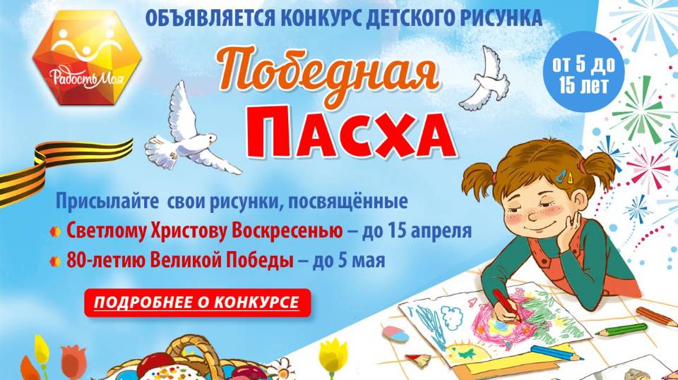 Конкурс детских рисунков «ПОБЕДНАЯ ПАСХА» Дорогие друзья! Телеканал «Радость моя» с радостью объявляет новый конкурс детских рисунков, который называется «ПОБЕДНАЯ ПАСХА». В конкурсе принимают участие юные художники от 5 до 15 лет. Принимаются работы, выполненные красками, карандашами или фломастерами. Участники присылают свои работы в формате jpg или pdf. Они должны быть подписаны. Также необходимо указать название рисунка, имя и фамилию автора, возраст, место проживания и номер телефона для связи. Обязательно. Ещё надо приложить ряд документов: согласие на обработку персональных данных, использование рисунка, участие в съёмках (а вдруг понадобится!). Условно конкурс делится на 2 темы. Присылайте рисунки, посвящённые • Светлому Христову Воскресенью – до 15 апреля • 80-летию Великой Победы – до 5 мая Все присланные работы будут показаны в эфире телеканала «Радость моя». Победители конкурса получат памятные призы. С нетерпением ждём ваших рисунков, друзья! Рисунки и все необходимые для участия в конкурсе формы согласия (4 формы) высылайте по адресу: victoriousspring@yandex.ru Положение. Конкурс рисунков. Победная пасха. 2025 radostmoya.ru/konkurs/ Согласия. Конкурс рисунков. Победная Пасха. 2025 radostmoya.ru/konkurs/ С нами в дом приходит радость! Смотрите и подписывайтесь на нас в соцсетях: https://rutube.ru/channel/24623268/ https://www.radostmoya.ru/ https://vk.com/tvradostmoya https://t.me/radostmoya_tv https://dzen.ru/radostmoya_tv
