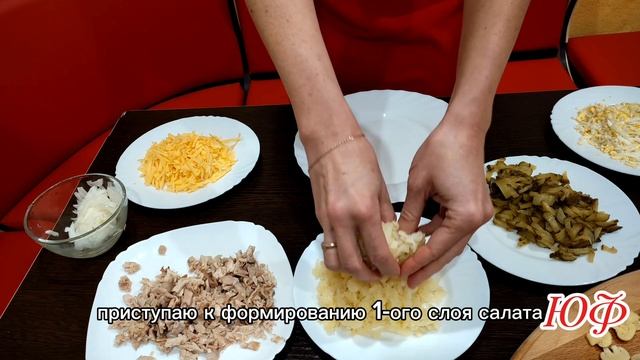 Вкусный и праздничный салат с необычной подачей. https://rutube.ru/channel/64443460/ Ингредиенты: Отварной картофель 2 шт Маринованный лук 1 шт Куриная грудка 1 шт Яйца 2 шт Твердый сыр 200 г Маринованные огурцы 3,4 шт Майонез 1 шт Приятного аппетита!