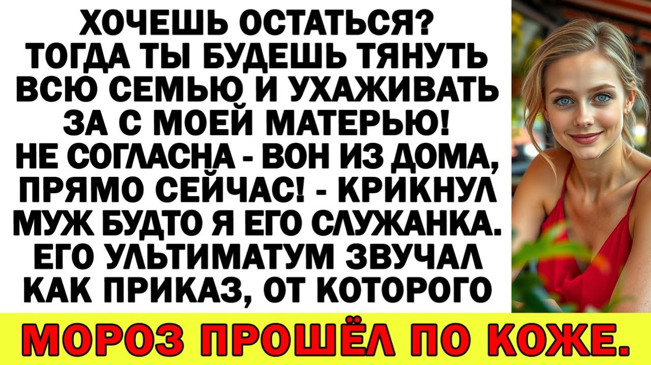 Хочешь остаться? Тогда ты будешь тянуть всю семью и ухаживать за с моей матерью! Не согласна — вон из дома, прямо сейчас! – Крикнул муж будто я его служанка. Его ультиматум звучал как приказ, от которого мороз прошёл по коже. Подборка историй из жизни с неожиданной концовкой: Истории из жизни| После развода муж ушёл. А его мама пришла… с багажом и без спроса. |Аудио рассказы - https://rutube.ru/video/4d565ef2db53df57c3a3570f94dd3361/ Свекровь учила меня семейной жизни… Муж поддакивал! Теперь живет у нее на раскладушке! - https://rutube.ru/video/a45ba8d386322b28a3b1acd16bc8c7a8/ Истории из жизни| Свекровь всполошилась |Аудио рассказы |Жизненные истории - https://rutube.ru/video/9b97e109cbd537dde3996440fc992e7c/ Муж решил вписать в мою квартиру свою маму после развода — но его ждала повестка! - https://rutube.ru/video/1a71e51ffddb89c1c7683bc2cdd1b621/ Истории из жизни| Родные решили, что все бесплатно, а я вложила 8500$ - https://rutube.ru/video/4b188c114d0fd7d51a6f1d515caf3a80/ Если любите сильные аудиорассказы и истории из жизни — этот рассказ вас не отпустит до финала. Здесь оживают настоящие семейные истории – драматичные, забавные, порой неожиданные, но всегда жизненные. Свекрови и невестки, тёщи и зятья, братья и сёстры – у каждого своя правда, свои эмоции и свои скандалы. Узнаваемые ситуации, острые конфликты и неожиданные развязки ждут тебя в каждом новом видео! Подпишитесь и напишите, как бы вы поступили на месте главных героев. Жизнь пишется без сценария, но каждая история оставляет след... #аудиорассказ #историяизжизни #жизненныеистории #семейнаядрама #предательство Аудиорассказ, аудиорассказы, история из жизни, истории из жизни, жизненная история, жизненные истории, семейная драма, про свекровь, про измену, про предательство, сильная история, рассказ до слёз, с неожиданной развязкой