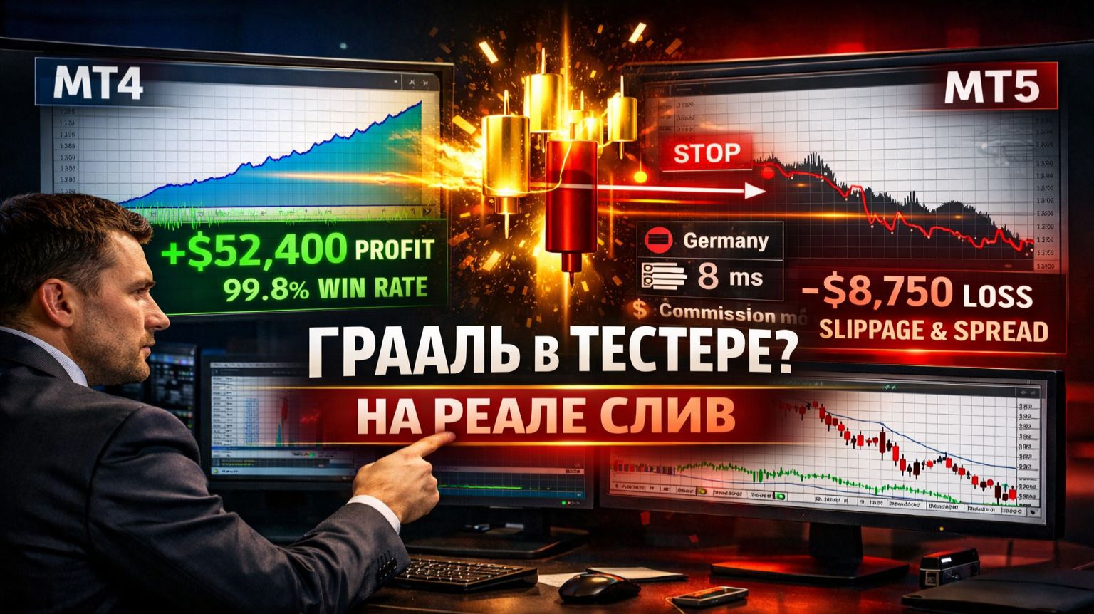 📈 MarketMind | Портфельное управление капиталом: https://t.me/MarketMind_SV 💼 Брокер, через которого я торгую (GTC FX): https://clck.ru/3SySVK 📊 Торговые идеи, количественный анализ и новости рынка: https://t.me/GTCFXCIS ————————————————————————— Идеальная equity curve в MT4, Recovery Factor 100+, “грааль найден”… а на реальном счёте робот начинает сливать. В этом видео показываю главную ошибку большинства алготрейдеров: поиск настроек в MetaTrader 4, которые в реальном рынке не имеют ничего общего с исполнением. Разбираем на практике: — почему MT4 strategy tester часто показывает ложную картину — почему breakout и scalping системы умирают на реале — как проскальзывание, latency и ночное расширение спреда ломают красивый бэктест — почему на XAUUSD можно потерять месяцы прибыли на одном news spike — как правильно использовать MT5 для real ticks, floating spread, commissions, swaps и realistic execution — почему я пишу 2 версии робота: MT4 для торговли и MT5 для поиска рабочих настроек — как смотреть на Recovery Factor, а не на “красивую линию” — какие реалистичные ожидания по algo trading можно считать адекватными в долгосрок Это видео особенно важно для тех, кто: ищет прибыльные forex robots, тестирует советники в MT4/MT5, занимается алгоритмическим трейдингом, private capital management или copy trading. ⏱ Таймкоды: 00:00 - Что в видео 01:08 - Конкурс 01:46 - Практикующий трейдер 02:25 - Что есть в МТ4 03:10 - Проскальзывание 04:26 - Плавающий спред 05:30 - Что может быть ночью 07:31 - Задержка 07:43 - Комиссии 08:06 - Своп 08:46 - Вывод по МТ4 09:16 - Случай из жизни 10:01 - Как лучше делать 10:23 - Плавающий спред 10:44 - Свопы 11:19 - Каждый тик 12:40 - Задержка 13:26 - Обратный пример 14:53 - Что можно оптимизировать в МТ4 15:57 - Как мы делаем 18:08 - Сделки можно копировать 20:20 - Сделки на Золоте 21:28 - Визуализация 22:43- Торгуй без свопа и комиссий 23:55 - Вывод #алготрейдинг #mt5 #mt4 #форексроботы #трейдинг