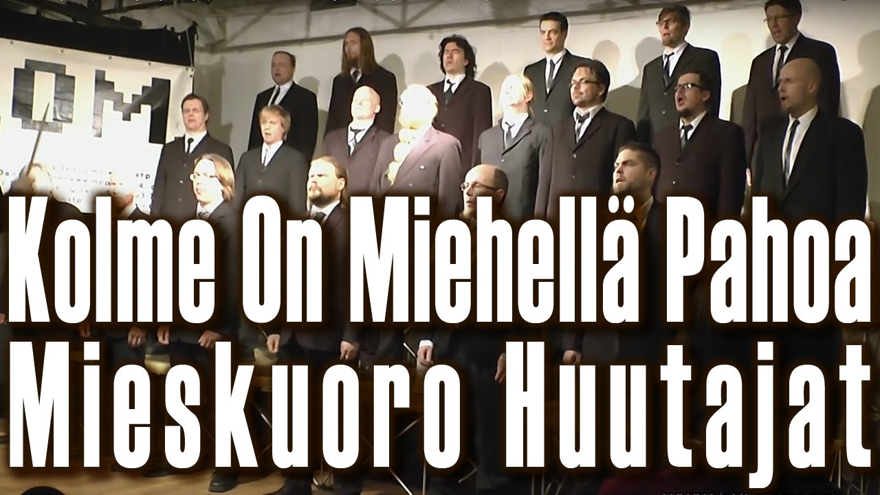 «Kolme On Miehellä Pahoa». Песня из альбома 1994 года «H.Y.V.Ä». Written: Petri Sirviö (слова Петри Сирвио), музыка народная. Хор орущих финских парней «Mieskuoro Huutajat» (Хор финских крикунов - Screaming Men choir of Oulu, Finland). Фрагмент концерта хора «Mieskuoro Huutajat» в Москве в Культурном центре «Дом» ( http://dom.com.ru ), 24 ноября 2012 года. Официальный сайт хора «Mieskuoro Huutajat» из Финляндии: http://www.huutajat.org/ Аудио и видео концерта: «РЕТРОпортал.ру» https://www.retroportal.ru/