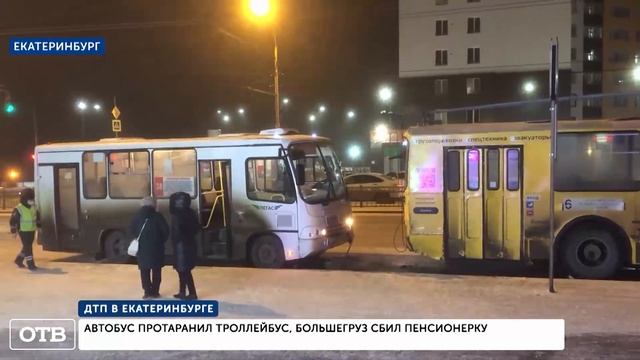В Екатеринбурге автобус протаранил троллейбус. Пострадали семь человек. ДТП случилось на улице Щербакова. По словам водителя автобуса, было очень скользко. Подъезжая к остановке, он не рассчитал расстояние до троллейбуса и не успел вовремя затормозить. От удара многие пассажиры упали. На Сибирском тракте грузовой автомобиль сбил пенсионерку, которая переходила дорогу на зелёный свет – она шла в магазин за продуктами. С переломами женщину доставили в больницу, но спустя четыре часа от полученных травм она скончалась. По словам водителя, при повороте он не заметил пенсионерку.