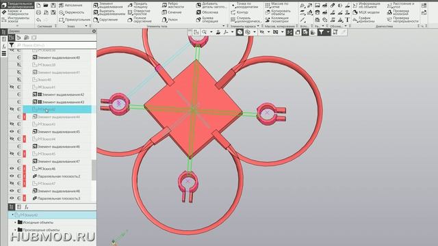 HUBMOD.RU 00:00:01 — Всем добрый день, в текущий урок мы будем заниматься тем, что раму имеющегося у нас микродрона будем максимально облегчать. Это очень важно, чтобы дрон был максимально легкий, чтобы емкостью батареи хватило на большее время полета. Для этого мы переходим в режим просмотра каркас и решаем для начала значительно облегчить дуги защиты винтов, 00:00:30 — сделать некоторую такую прорезь в этих обводах, которая в принципе не несет на себе большой физической нагрузки, а служит лишь для случайного столкновения с посторонними предметами. Сама дуга у нас достаточно большая, судя по всему она где-то миллиметров 6−7 в высоту, мы из нее вырезаем порядка двух миллиметров. 00:00:52 — Именно делаем это на каркасе, чтобы видеть насквозь весь собственно механизм рамы симметрично переносим макет выреза на правоположную сторону для этого используем инструмент цика зеркально отобразить вот мы даем обозначаем центр зеркального переноса далее мы его вставляем на свое место скопированный элемент эскиза и дальше должны будем вырезать 00:01:26 — но пока что мы его копируем, сохраняем в буфер обмена, чтобы на перпендикулярной стороне уже без всевозможных измерений сразу же достать из буфера и выложить готовый скиз для дальнейшей вырезки. Вот мы трехмерно видим, что у нас будет вырезаться. Здесь мы визуально редактируем именно количество выреза. Мы смотрим, чтобы в обе стороны одинаково и симметрично вырезалось. 00:01:55 — Ли этого делаем вырез симметричный. Задаем размер непосредственно выреза. Программа нам показывает, что именно будет вырезано. Мы видим, что да, мы согласны. Именно столько нам нужно отрезать. Подтверждаем. Смотрим визуально. Вот такой вырез у нас получился. Я думаю, что конструкцию он облегчит только этот вырез грамм на 5 как минимум. Сейчас мы должны сделать еще такой же вырез, но с перпендикулярной стороны. 00:02:27 — Для этого мы находим сначала плоскость, на ней строим эскиз на плоскости. Вот мы обозначили, построили эскиз на перпендикулярной плоскости. Далее мы зашли опять же в режим каркаса и достали из буфера обмена эскиз геометрических фигур, которыми будем вырезать. 00:02:52 — Вставили и соответственно вырезали выдавливанием. Перешли в макет трехмерного просмотра. Видим, что вырез получился именно такой, как мы желаем увидеть. Задаем ему нужную длину, подтверждаем и опять же проверяем визуально. Да, вырез есть, дуги стоят, но вот гран 6−7-8 мы из общей весоконструкции вырезали, что уже непременно очень хорошо. 00:03:24 — Дальше мы начинаем думать, что еще можно здесь отрезать, чтобы с одной стороны жесткость конструкции не уменьшить, с другой стороны, чтобы все-таки ее каким-то максимальным образом облегчить. Ну и сразу в глаза бросается, что эта вот корзина центральная под микроконтроллер полета, она имеет чересчур толстые стенки. Мы видим, да, столько жесткости нам не нужно, а вот грамм пять из этой конструкции можно отрезать путем именно уменьшение этих стенок. 00:03:54 — Мы ищем на ком эскизе находятся непосредственно геометрические фигуры, которые мы будем вырезать. Для этого пробегаемся по эскизам, хотя в принципе можно сразу же выделить необходимый элемент и там тоже в диалогом окне увидеть на ком эскизе нужно поработать, чтобы определить, что нужно изменить. Также мы здесь видим, что в принципе можно сделать тоньше и и крепежные элемент