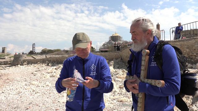 Послание Бутылочной почты пешей экспедиции "Великий русский путь" с Херсонеса, Крымской Республики РФ в Черное море. 7 апреля 2024 год. Послание в Бутылке отправлено на русском языке на бланке Министерства Морской & Бутылочной Почты, переведенное на различные языки (японский, китайский, корейский, английский). Отправители: кругосветный путешественник Валерий Шанин