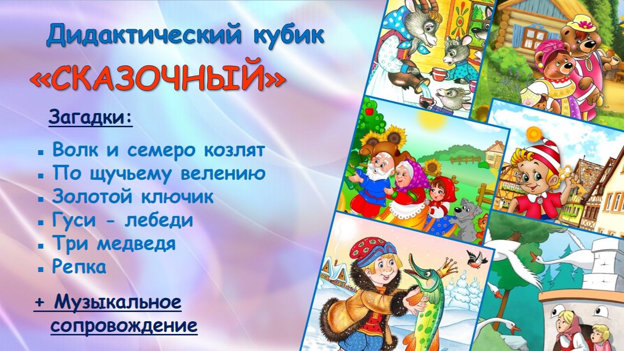 Дидактический кубик «СКАЗОЧНЫЙ» с загадками и музыкальным сопровождением. • Рекомендуемый возраст: старший, подготовительный. • Используется в тематическом спортивном развлечении «За здоровьем в сказку» - см. видео https://vk.com/wall-212562500_1317 • Приобрести дидактический кубик «Сказочный» https://vk.com/market/product/kubik-quotskazochnyquot-212562500-14723091 • Дидактический кубик «Сказочный» содержит загадки: Волк и семеро козлят, По щучьему велению, Золотой ключик, Гуси – лебеди, Три медведя, Репка. • Как изготовить дидактический кубик https://vk.com/wall-212562500_1045 • Читайте статью про Дидактические кубики https://vk.com/@joymotion_23-didakticheskie-kubiki