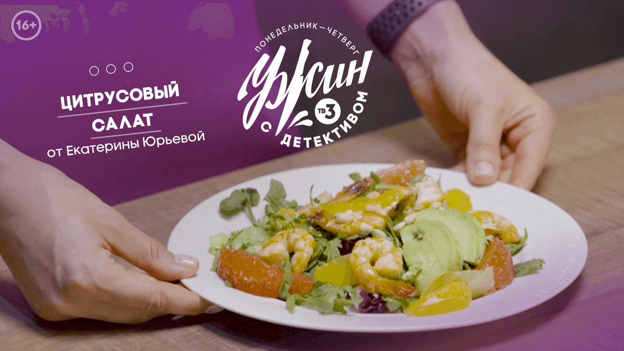 Добавим немного экзотики в ваши будни! Вместе с блогером Екатериной Юрьевой мы приготовим цитрусовый салат? Для этого блюда нам понадобятся: Апельсин – 3 шт. Грейпфрут – 1 шт. Креветки – 200 г. Масло оливковое – 50 г. Чеснок – 2 зубчика Лимон – 1 шт. Авокадо – 1 шт. Листья салата (разные салаты) – 300 г. Соевый соус – 50 г. Мед – 2-3 ст. л. Приготовление: Шаг 1. Дольки апельсина и грейпфрут очистить от кожи. В сковородку налить оливковое масло, добавить измельченный чеснок, креветки и обжаривать 2-3 минуты. Шаг 2. Авокадо порезать на дольки, выложить в миску, добавить листья салата и цитрусы. Перемешать. Затем выложить на тарелку. Сверху положить креветки. Шаг 3. Мед и соевый соус смешать с апельсиновым соком, полить на салат и подавать к столу. Приятного аппетита? #УжинСДетективом