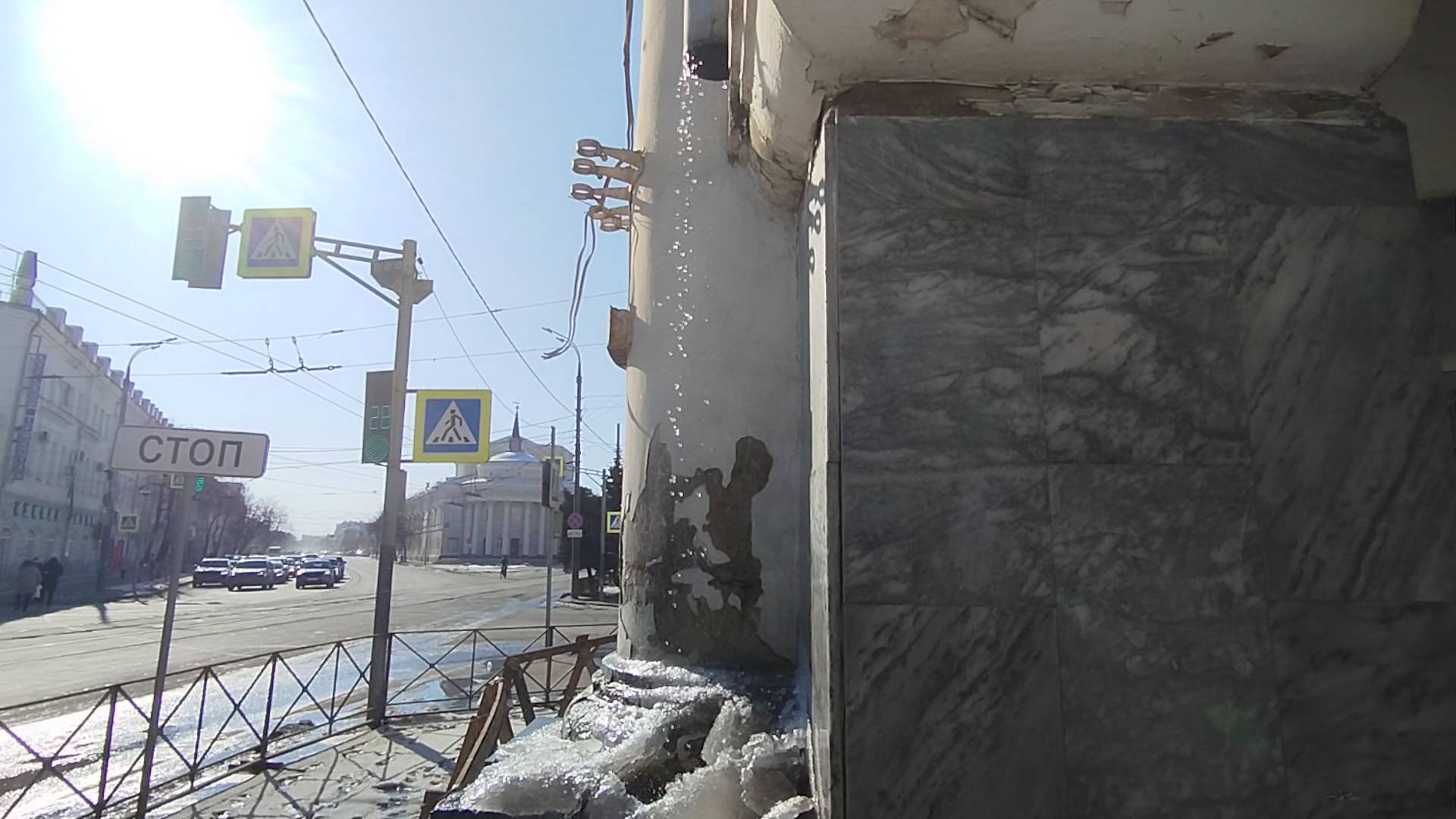 В городе здания. Из трубы течёт вода