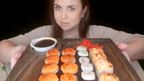 ? МУКБАНГ ? РОЛЛЫ. Очень острые роллы с кальмаром и запеченные с лососем.