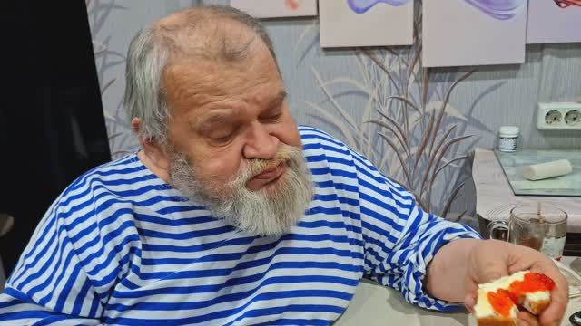 -45 за окном Пенсионер ест на завтрак хлеб с маслом и красной икрой Жизнь зимой в Сибири