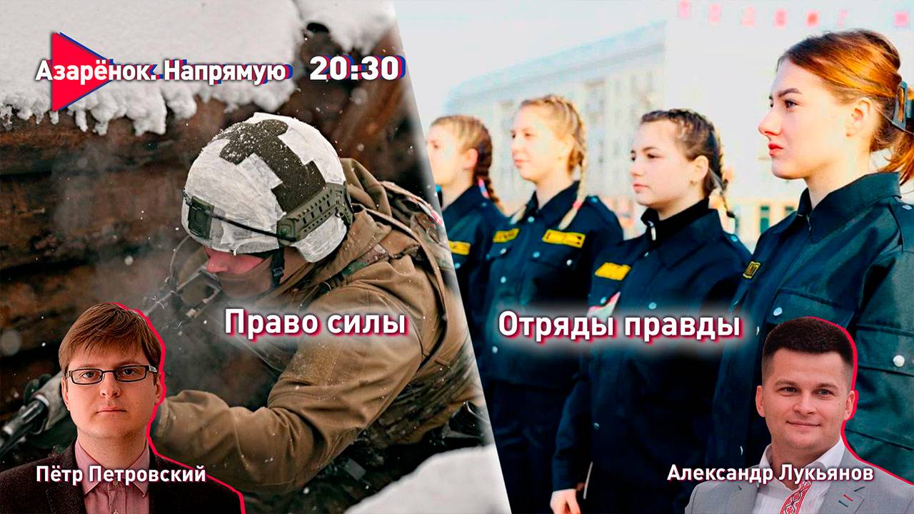 Присоединяйтесь к нашему Telegram-чату: https://t.me/+qTXxHkhwB6ZhOTIy 6 февраля в 20:30. Проект «Азарёнок. Напрямую». О важном говорим в прямом эфире. Вместе с экспертом обсудим «право силы» в современных реалиях и поговорим о патриотическом воспитании в молодёжной среде. В гостях политолог Пётр Петровский, первый секретарь Центрального комитета БРСМ Александр Лукьянов.
