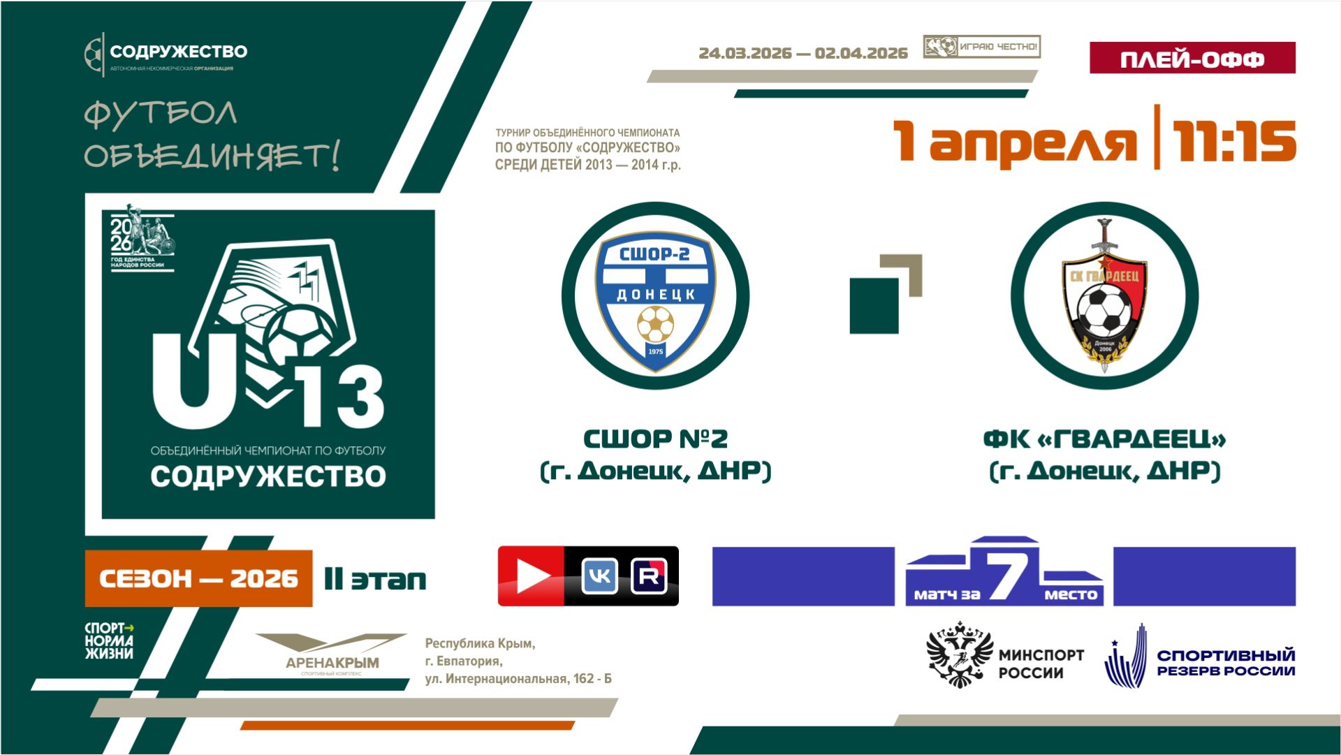 Игра за 7-ое место | СШОР №2 (г. Донецк, ДНР) - ФК «Гвардеец» (г. Донецк, ДНР) | 1.04.2026 | 11:15