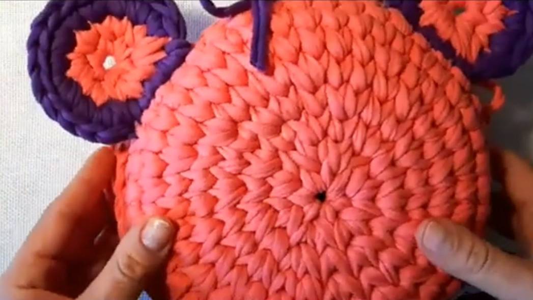 Вяжем ушки к круглой сумке мышь из трикотажной пряжи. Часть 2