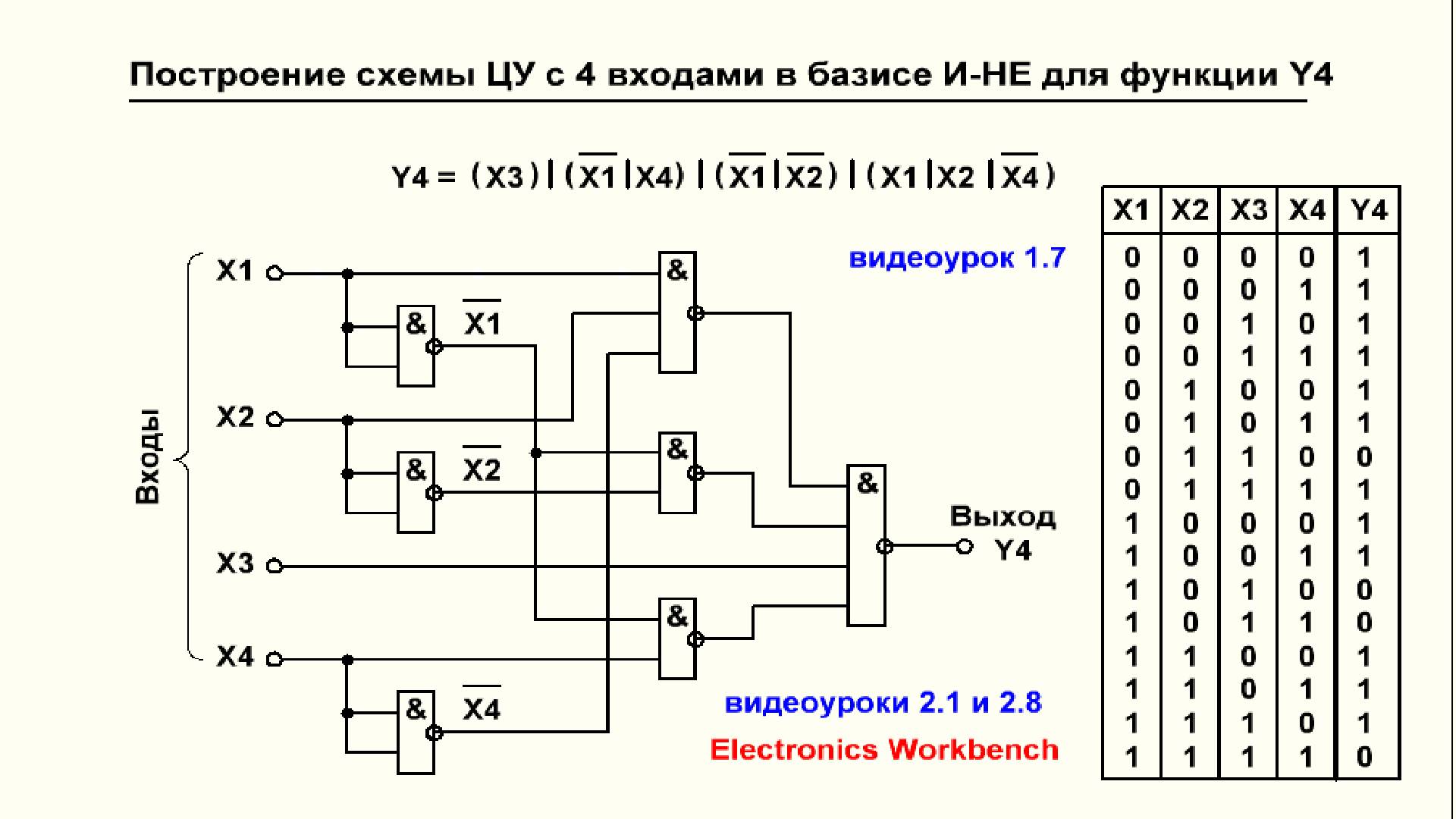 Видеоурок 2.21. Построение схемы ЦУ в базисе И-НЕ для функции 4-х переменных Y4.
