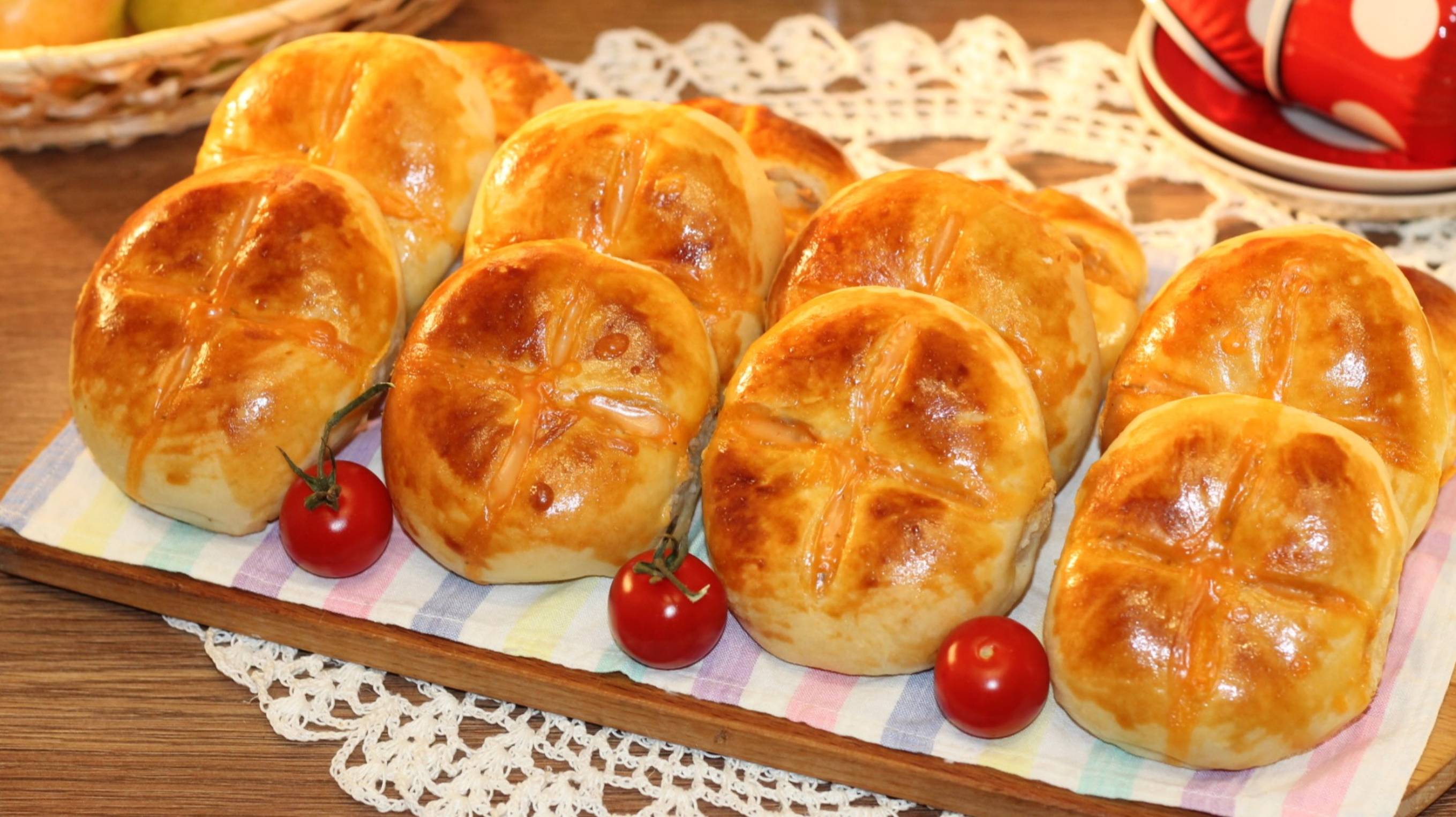 Пышные, ароматные, мягкие и вкусные пироги с мясной и овощной начинкой. Пирожки выпекались с соусом. - Ингредиенты: Тесто: мука пшеничная — 450 гр тёплое молоко — 250 мл дрожжи сухие — 5 гр. сахар — 1 ст.л. яйцо куриное — 1 шт (1 белок в тесто, желток на смазку пирогов) растительное масло — 40 мл сливочное масло — 30 гр. (мягкое или сливочный маргарин) разрыхлитель теста — 2/3 ч.л. соль — 1 ч. л. (без горки в тесто) -- Начинка: фарш мясной — 400 г (говядина+свинина) лук репчатый — 1 шт капуста белокочанная — 300 г масло растительное — 3 ст.л. приправа — 0,5 ч.л. специи -- Соус сметана — 1 ст.л. (20%) кетчуп — 1 ст.л. (или 0,5 ст.л. пасты+1 щеп. сахара) яйцо куриное — 1 шт (белок в соус, желток на смазку пирога) сыр мягкий — 1 ст.л. (плавленный) приправа — 0,5 ч.л. специи - 12 шт 180 ч