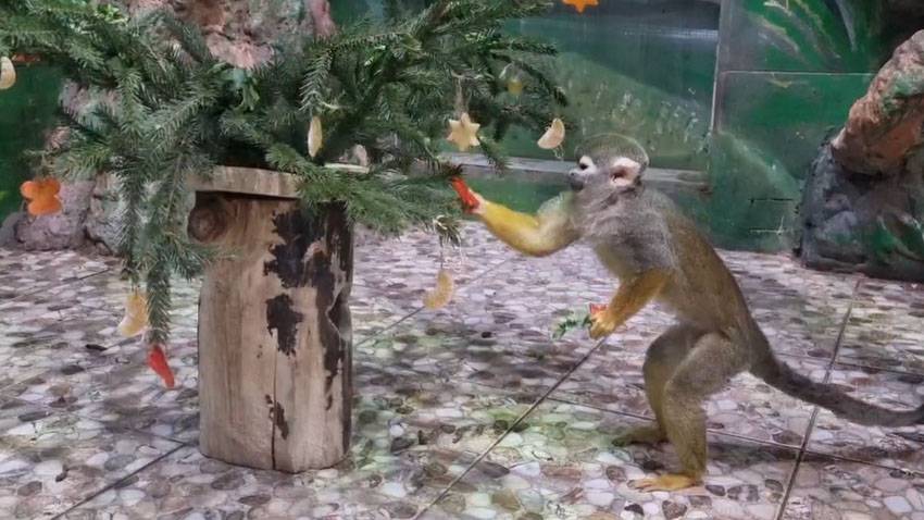 Обитатели Зооэкзотариума в Ярославском зоопарке уже почувствовали приближение Нового года. В преддверии волшебного праздника яванским макакам и саймири подарили новогодние букеты из еловых веточек и вкуснейших лакомств. Подарки были по достоинству оценены - питомцы сначала умяли свои любимые бананы, а потом и остальные фрукты и овощи.