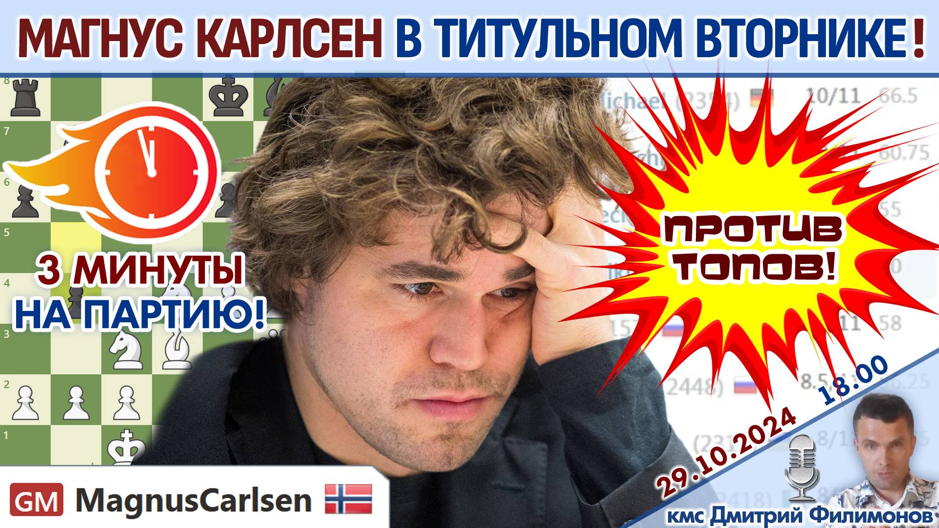Карлсен играет Титульный вторник! ⏰ 29 октября 2024, 18.00 🎤 Дмитрий Филимонов ♕ Шахматы блиц