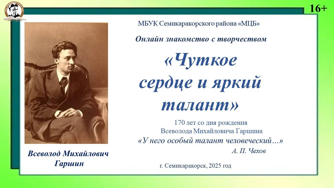 Онлайн знакомство «Чуткое сердце и яркий талант» (170 лет со дня рождения В. М. Гаршина)
