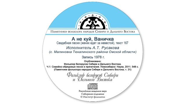 Свадебная песня (жених едет за невестой), текст 167. Исполнитель А.Т. Русакова (с. Малиновка Тюкалинского района Омской области). Запись 1978 г. Опубликовано: Фольклор белорусов Сибири и Дальнего Востока. Ч. 1: Семейно-обрядовые песни и причитания. Новосибирск: Наука, 2011. 548 с. (Памятники фольклора народов Сибири и Дальнего Востока; Т. 31)