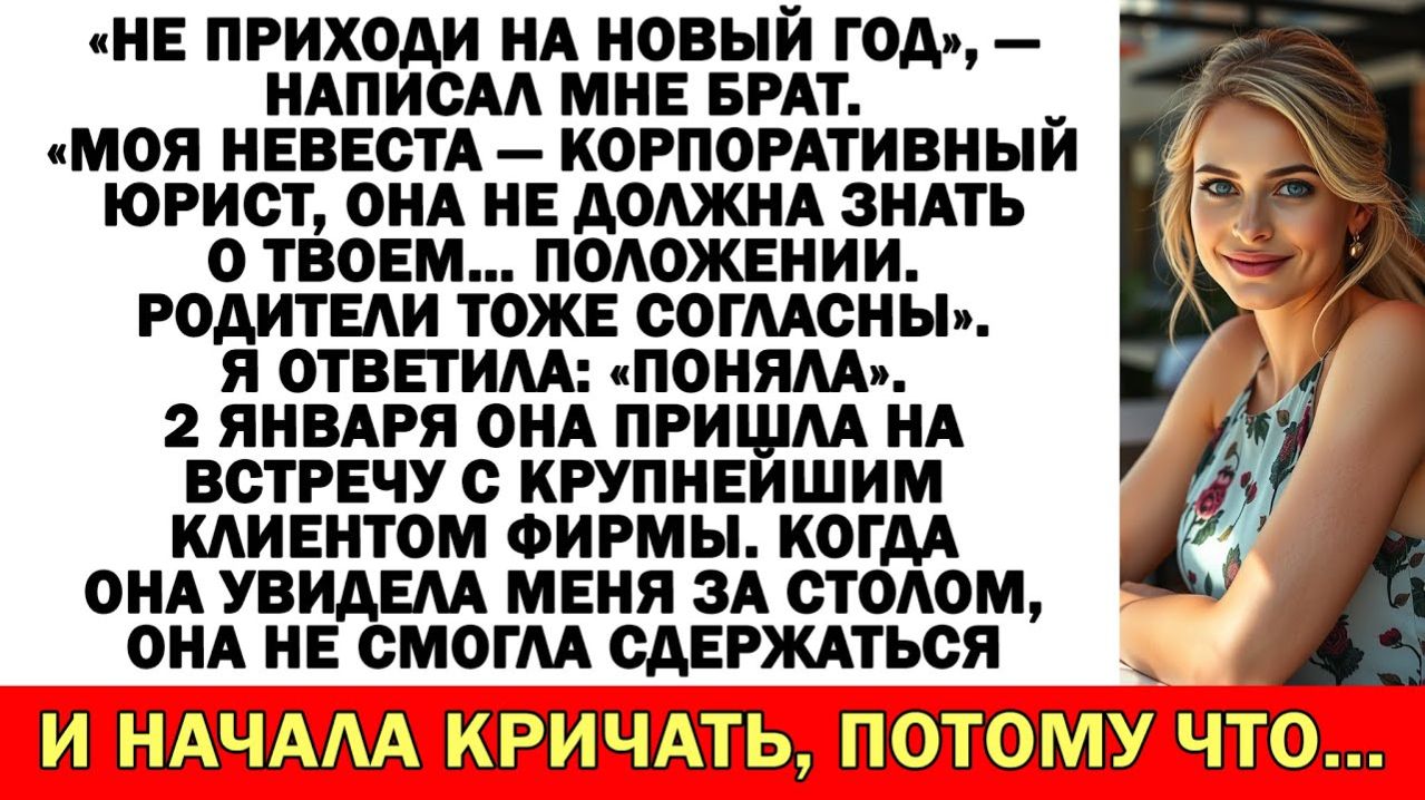 «Не приходи на Новый год», — написал мне брат. «Моя невеста — корпоративный юрист, она не должна знать о твоем… положении. Родители тоже согласны». Я ответила: «Поняла». 2 января она пришла на встречу с крупнейшим клиентом фирмы. Когда она увидела меня за столом, она не смогла сдержаться и начала кричать, потому что… Подборка историй из жизни с неожиданной концовкой: Истории из жизни| После развода муж ушёл. А его мама пришла… с багажом и без спроса. |Аудио рассказы - https://rutube.ru/video/4d565ef2db53df57c3a3570f94dd3361/ Свекровь учила меня семейной жизни… Муж поддакивал! Теперь живет у нее на раскладушке! - https://rutube.ru/video/a45ba8d386322b28a3b1acd16bc8c7a8/ Истории из жизни| Свекровь всполошилась |Аудио рассказы |Жизненные истории - https://rutube.ru/video/9b97e109cbd537dde3996440fc992e7c/ Муж решил вписать в мою квартиру свою маму после развода — но его ждала повестка! - https://rutube.ru/video/1a71e51ffddb89c1c7683bc2cdd1b621/ Истории из жизни| Родные решили, что все бесплатно, а я вложила 8500$ - https://rutube.ru/video/4b188c114d0fd7d51a6f1d515caf3a80/ Если любите сильные аудиорассказы и истории из жизни — этот рассказ вас не отпустит до финала. Здесь оживают настоящие семейные истории – драматичные, забавные, порой неожиданные, но всегда жизненные. Свекрови и невестки, тёщи и зятья, братья и сёстры – у каждого своя правда, свои эмоции и свои скандалы. Узнаваемые ситуации, острые конфликты и неожиданные развязки ждут тебя в каждом новом видео! Подпишитесь и напишите, как бы вы поступили на месте главных героев. Жизнь пишется без сценария, но каждая история оставляет след... #аудиорассказ #историяизжизни #жизненныеистории #семейнаядрама #предательство Аудиорассказ, аудиорассказы, история из жизни, истории из жизни, жизненная история, жизненные истории, семейная драма, про свекровь, про измену, про предательство, сильная история, рассказ до слёз, с неожиданной развязкой