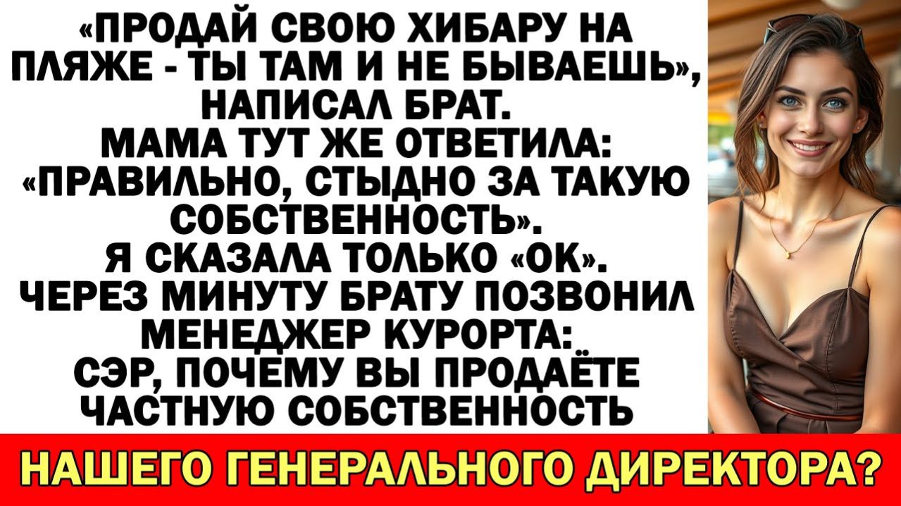«Продай свою хибару на пляже — ты там и не бываешь», написал брат. Мама тут же ответила: «Правильно, стыдно за такую собственность». Я сказала только «ок». Через минуту брату позвонил менеджер курорта: Сэр, почему вы продаёте частную собственность нашего генерального директора? Подборка историй из жизни с неожиданной концовкой: Истории из жизни| После развода муж ушёл. А его мама пришла… с багажом и без спроса. |Аудио рассказы - https://rutube.ru/video/4d565ef2db53df57c3a3570f94dd3361/ Свекровь учила меня семейной жизни… Муж поддакивал! Теперь живет у нее на раскладушке! - https://rutube.ru/video/a45ba8d386322b28a3b1acd16bc8c7a8/ Истории из жизни| Свекровь всполошилась |Аудио рассказы |Жизненные истории - https://rutube.ru/video/9b97e109cbd537dde3996440fc992e7c/ Муж решил вписать в мою квартиру свою маму после развода — но его ждала повестка! - https://rutube.ru/video/1a71e51ffddb89c1c7683bc2cdd1b621/ Истории из жизни| Родные решили, что все бесплатно, а я вложила 8500$ - https://rutube.ru/video/4b188c114d0fd7d51a6f1d515caf3a80/ Если любите сильные аудиорассказы и истории из жизни — этот рассказ вас не отпустит до финала. Здесь оживают настоящие семейные истории – драматичные, забавные, порой неожиданные, но всегда жизненные. Свекрови и невестки, тёщи и зятья, братья и сёстры – у каждого своя правда, свои эмоции и свои скандалы. Узнаваемые ситуации, острые конфликты и неожиданные развязки ждут тебя в каждом новом видео! Подпишитесь и напишите, как бы вы поступили на месте главных героев. Жизнь пишется без сценария, но каждая история оставляет след... #аудиорассказ #историяизжизни #жизненныеистории #семейнаядрама #предательство Аудиорассказ, аудиорассказы, история из жизни, истории из жизни, жизненная история, жизненные истории, семейная драма, про свекровь, про измену, про предательство, сильная история, рассказ до слёз, с неожиданной развязкой