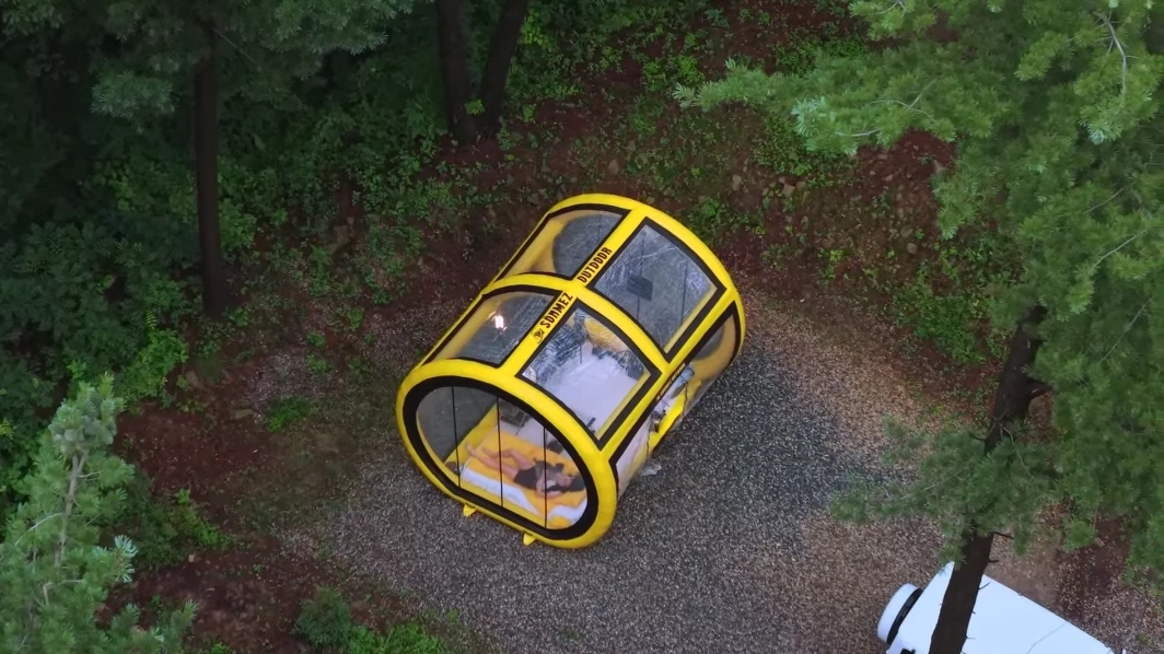 Кемпинг под дождем в огромной надувной палатке.