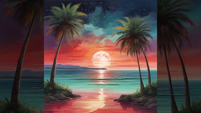 Спокойные ноты музыки заполняют воздух, отражаясь в мягких оттенках пейзажа: темнеющее небо, игра света на волнах, силуэты пальм, подсвеченные лунным светом – все это создает умиротворенную атмосферу на холсте.