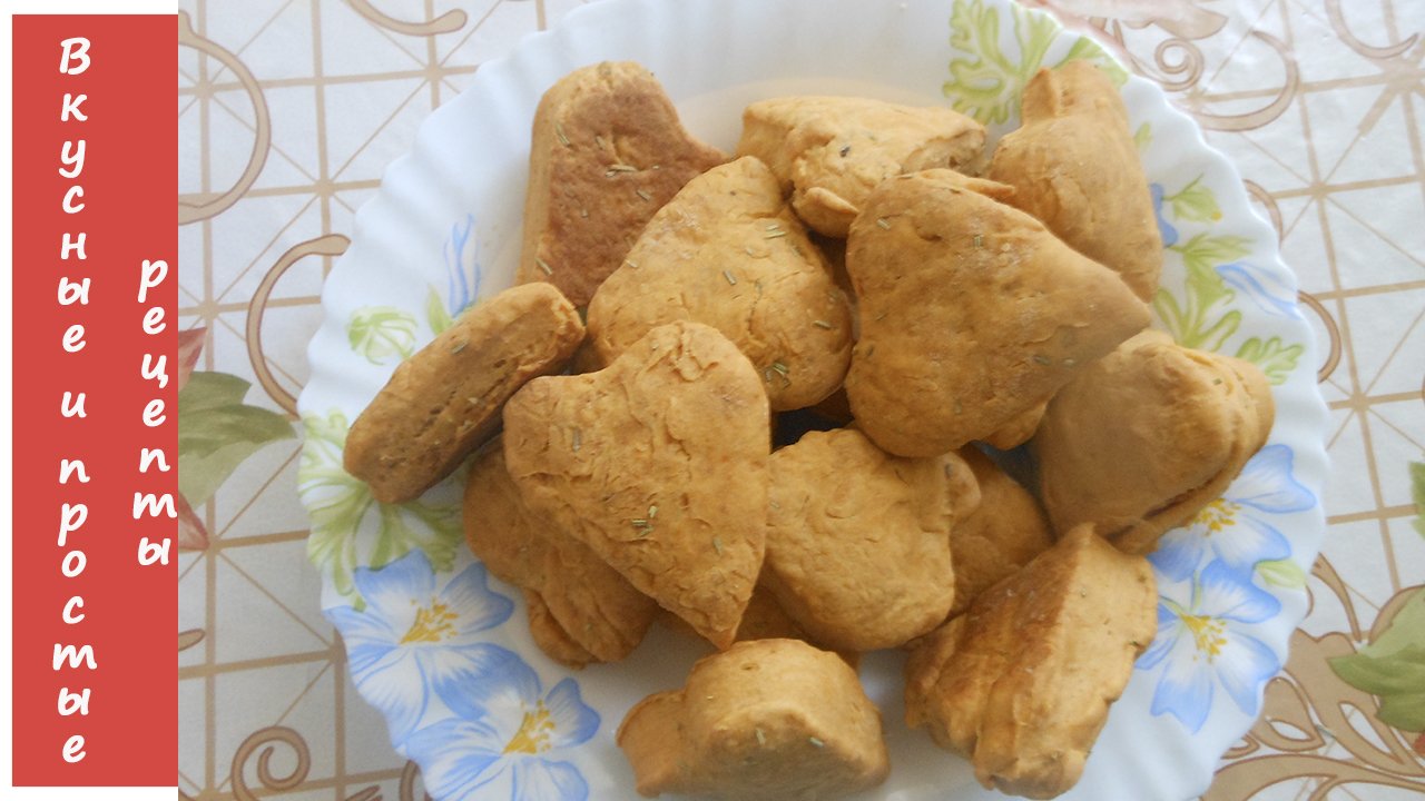 Это печенье привлекло моё внимание не только отсутствием жиров животного происхождения, но и своей основой — томатной пастой… Кстати, можно приготовить его и на томатном соке. Спешу поделиться рецептом с вами) Вот ингредиенты: мука - 350-400г вода - 100 мл растительное масло - 40 мл томатная паста - 2 ст. л. сахар - 10г соль - 5г сушеный розмарин - 5г сода - 3г. Способ приготовления: 1. Томатную пасту размешиваем в 100 мл. воды комнатной температуры. В однородную по цвету жидкость вливаем растительное масло. 2. Добавляем сахарный песок, соль и размешиваем, до растворения кристаллов. 3. Всыпаем муку, смешанную с содой, замешиваем очень мягкое, податливое, пластичное и чуть липкое тесто. 4. Всыпаем розмарин в тесто и хорошо вмешиваем его. 5. Раскатываем тесто,вырезаем печенье. 6. Печенье раскладываем по противню, застеленному промасленной пекарской бумагой, оставляя между ними интервал 2-3 см. Постное печенье на томатном соке сбрызгиваем водой, одни посыпаем розмарином, солью, другие - сахаром. Выпекаем 20 минут при температуре 200С. 7. Готовое печенье остужаем на противне и подаем к столу горячим или холодным. Приятного аппетита))) Все просто,быстро и вкусно! Спасибо за просмотр,надеюсь рецепт вам пригодиться) Подписывайтесь на канал,будем готовить вместе! Всем пока-пока!!!