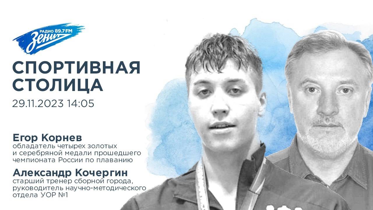 В эфире «Спортивной столицы» побывают обладатель четырёх золотых и серебряной медали чемпионата России по плаванию на короткой воде 2023 года Егор Корнев и старший тренер сборной города, руководитель научно-методического отдела УОР №1 Александр Кочергин.